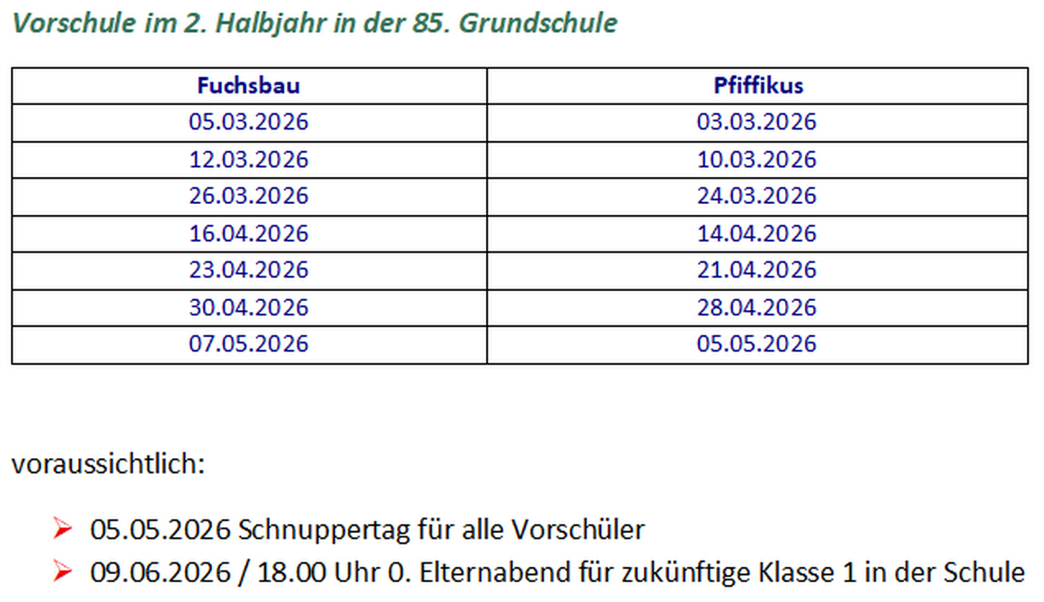 Termine Vorschule 2026 - 85.Grundschule Dresden