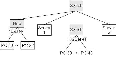 Im nachfolgenden Bild sind in einem BUS-Netz an den Segmenten 1 und 3 die Arbeitsstationen PC10..PC28 bzw. PC30..PC48 angeschlossen: