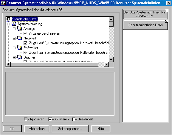 Zunächst sollte man ein neues Richtlinienpaket für Benutzer/Benutzergruppen erstellen, in dem die nachfolgenden Richtlinien, mindestens jedoch die Benutzer-Systemrichtlinie, aktiviert sind.