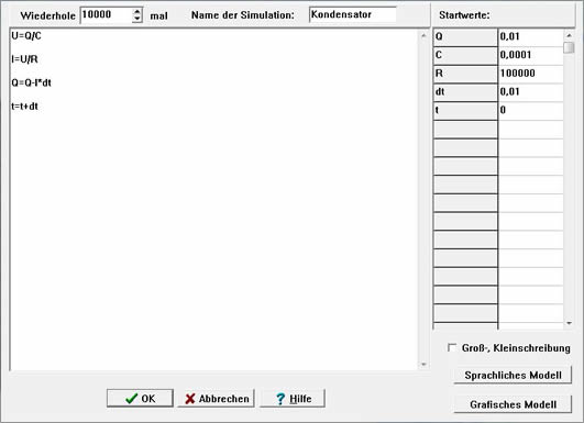 Entladekurve eines Kondensators Aufgabe: Gegeben ist ein Kondensator mit der Kapazität von C = 100 µF und der Ladungsmenge von Q = 10 mC zum Zeitpunkt t = 0. Dieser Kondensator wird aufgeladen und über einen Widerstand R = 100kΩ entladen. Zeichnen Sie den Schaltplan und entwickeln Sie ein Modell zur Simulation des Entladevorgangs.