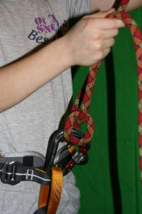In dieser Position tunnelt die rechte Hand das Bremsseil bis ca. handbreit über den Karabiner. Vorsicht, beim Umschlagen des Knotens im Falle eines Sturzes wird Seil in das Sicherungsgerät gezogen! |