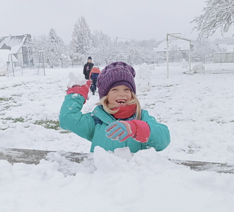 Die winterliche Stille wurde sehr bald von freudigen Kinderstimmen durchbrochen. Die Mädchen und Jungen der Grundschule Malschwitz, ausgerüstet mit Mütze, Handschuhen, Stiefeln sowie dicken Jacken und Schneehosen, eroberten in der Hofpause den tief verschneiten Sportplatz im Nu. Da wurden unzählige riesige Kugeln für Schneemänner gerollt, Schneeengel erschaffen, Schneemauern gebaut und Schneelöcher geschaufelt. Die Kinderaugen leuchteten, die Wangen wurden rosig und überall sahen wir glückliche Gesichter. Danke, Frau Holle!