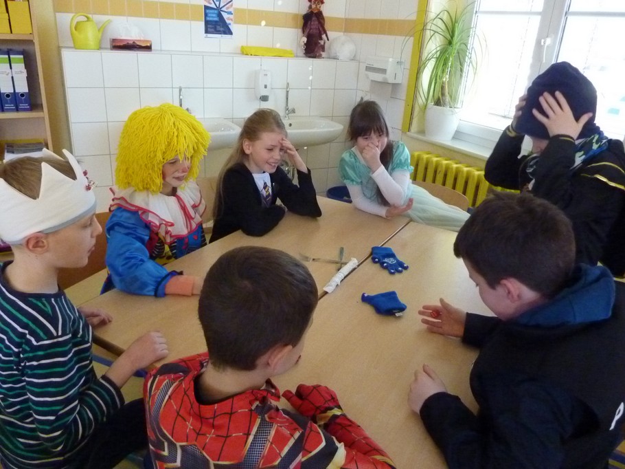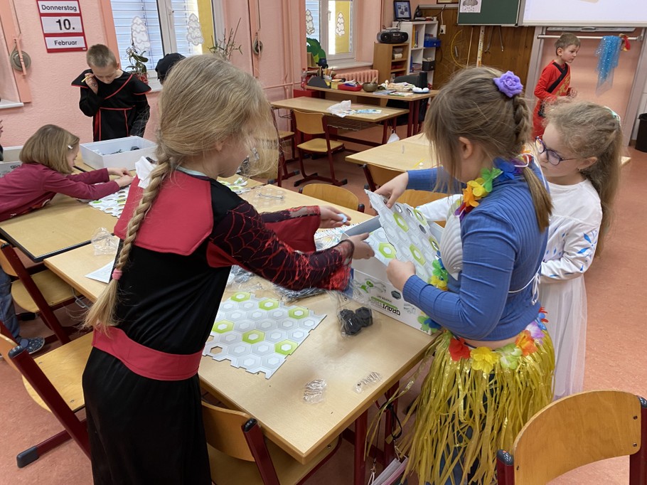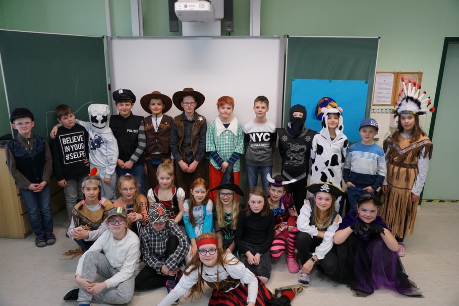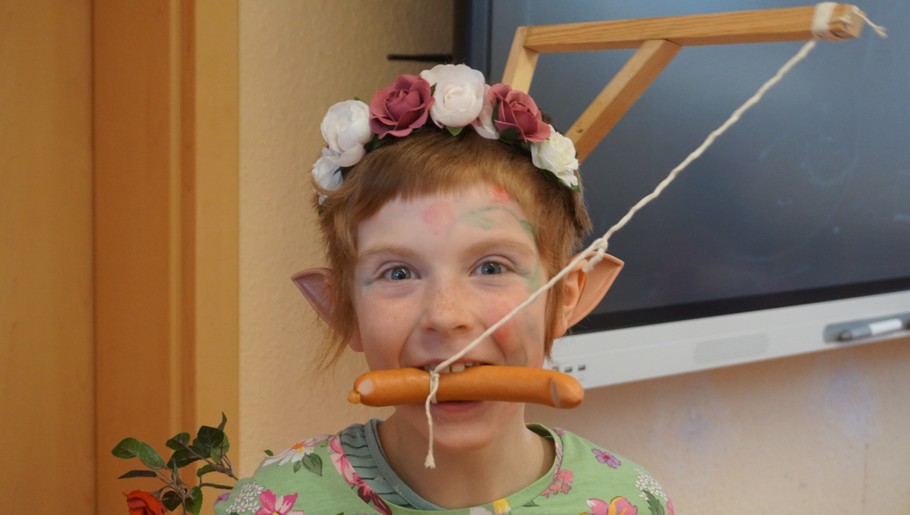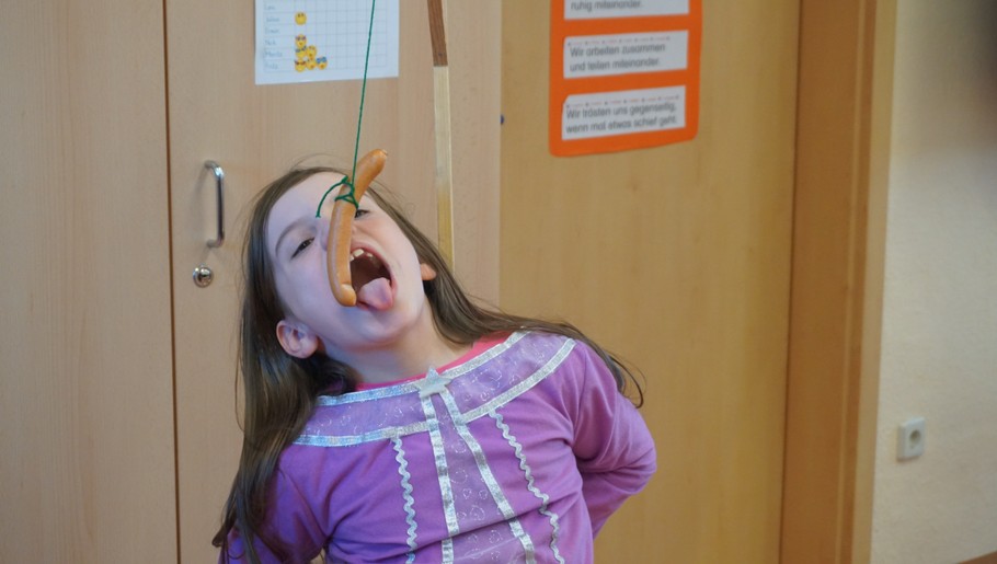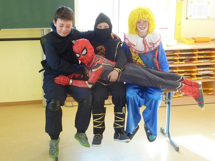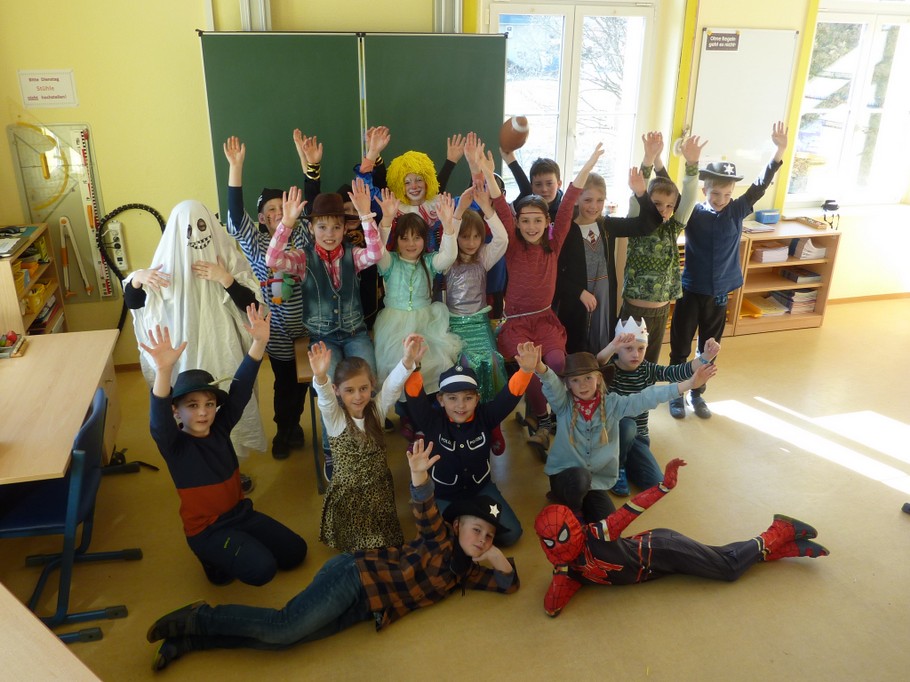 Und so hatten auch ohne große Turnhallenparty alle ihren Spaß, sei es beim Luftballontanz, beim Trinkröhrchenspiel oder beim berühmten Würstchen-Galgen. Wunderschöne farbenfrohe Kostüme waren in ganzen Haus unterwegs. Auffallend viele Prinzessinnen waren zum Faschingstag in die Schule gekommen, aber auch mehrere Polizisten, die für Ordnung sorgten, einige gefährliche schwarze Ninjas und Piraten, diverse Tiere und eine Menge Zaubervolk mit Elfen und Feen.