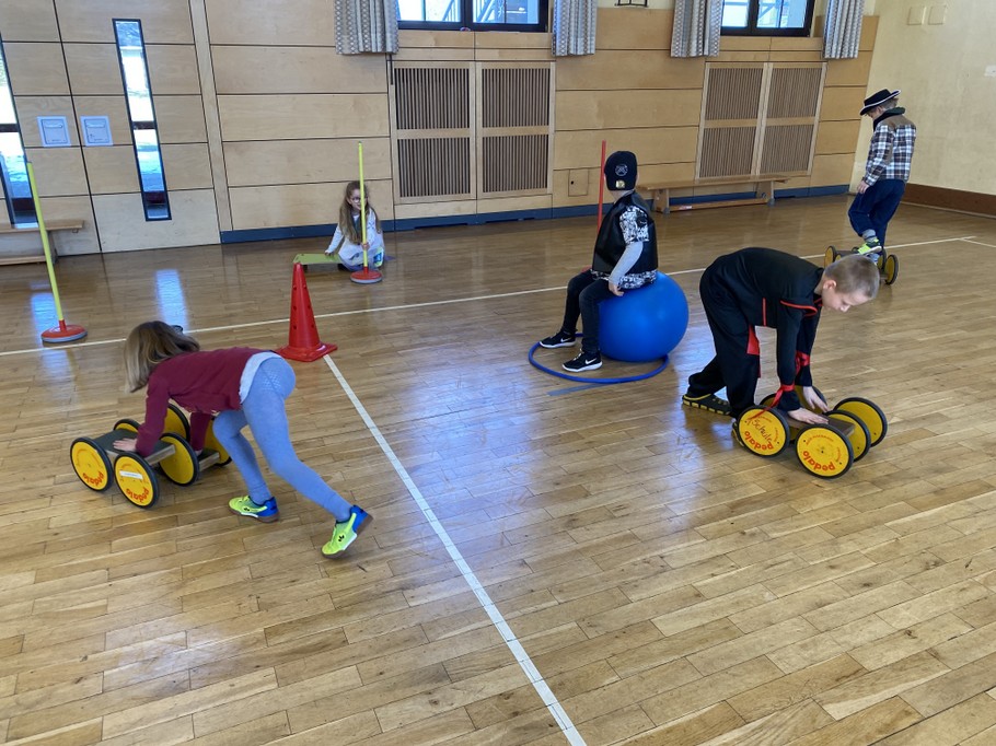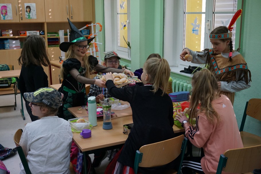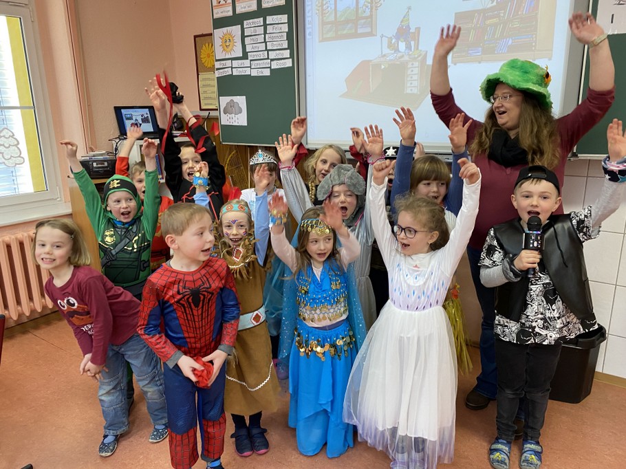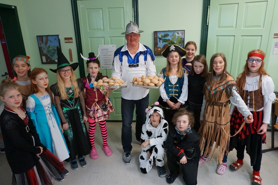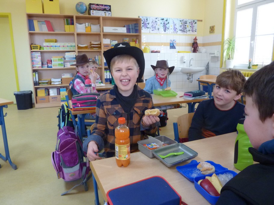 Und so gab es nach zwei Stunden Unterricht in Deutsch und Mathematik einen fröhlichen Vormittag in den Klassen mit Bewegungsangeboten in der Turnhalle, lustigen Spielen im Klassenverband und einem sehr leckeren Pfannkuchenfrühstück. Über 100 Pfannkuchen in Spezial-Grundschulgröße wurden von unserer ortsansässigen Bäckerei Jähn dafür gespendet. Darüber haben wir uns sehr gefreut und bedanken uns sehr herzlich. Sogar die Senfpfannkuchen, die natürlich nicht fehlen durften, wurden angebissen - und gleich wieder ausgespuckt. Aber zum Glück war genügend Gebäck mit Marmelade vorhanden, um die Pechvögel , zu denen auch unser armer Hausmeister gehörte, zu trösten...