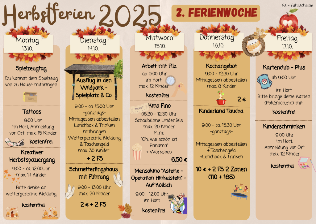 Sie haben Ihr Kind für die Herbstferien im Hort der Johanna-Magdalena-Beyer-Schule angemeldet. Für diese Zeit haben wir für Sie einige wichtige Hinweise zusammengetragen. Es besteht für berechtigte Familien die Möglichkeit, über das Bildungspaket eine Übernahme der Kosten für die im Hort durchgeführten Veranstaltungen zu beantragen. Die Beantragung muss vorab mit dem Jobcenter abgestimmt werden. In den Sommer – und Winterferien haben Sie die Möglichkeit einen Ferienpass zu erwerben.