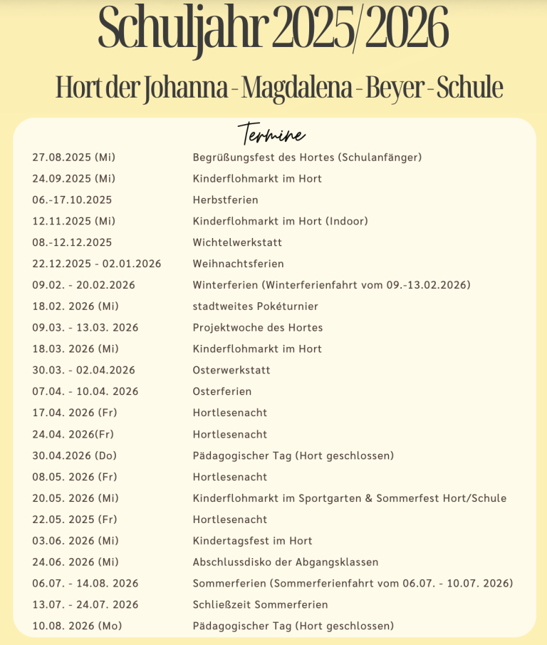 Wir freuen uns, Sie und ihre Kinder im Hort der Johanna-Magdalena-Beyer-Schule willkommen zu heißen.