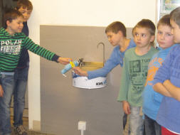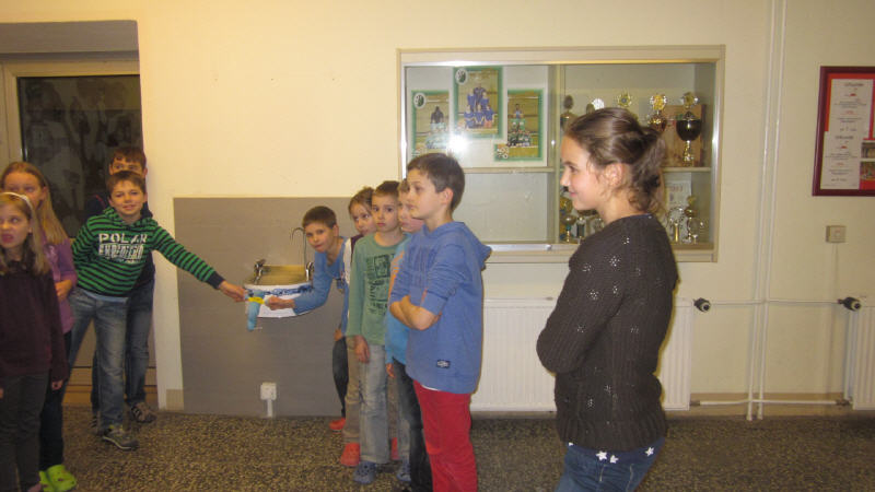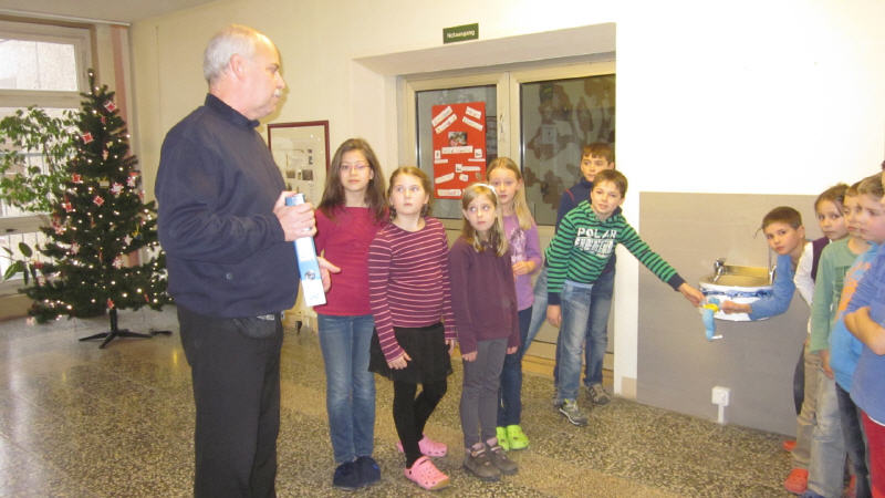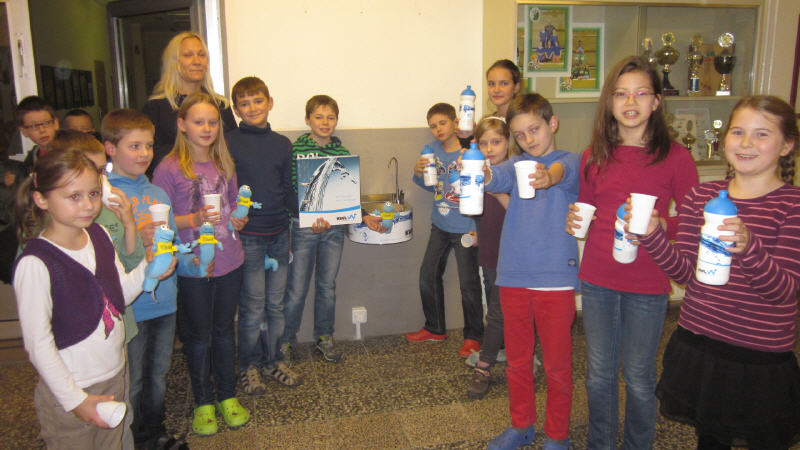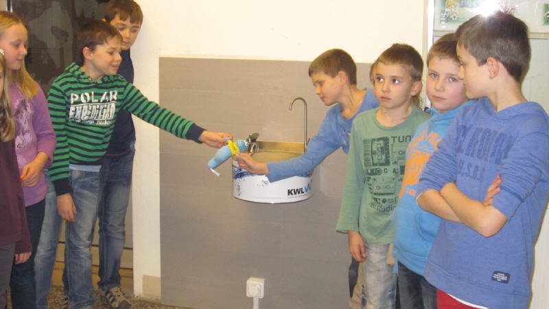 Endlich hat auch unsere Grundschule einen Trinkbrunnen. Die Kommunalen Wasserwerke Leipzig übergaben ihn am 5. Dezember 2014 an die Schülersprecher. Alle Kinder können sich nun immer frisches Wasser in der Eingangshalle holen. Sie freuten sich auch über neue Trinkflaschen und Wassi, den Wasser- Wurm.