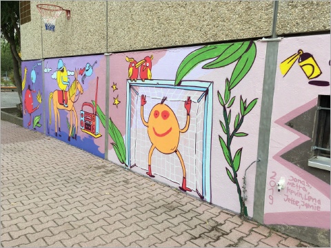 Graffiti wirkt in all ihrer Vielfalt für Kinder enorm anziehend und interessant. Sechs Kinder aus der 4. Klassenstufe, konnten diese Kunstart an der Theodor- Körner Grundschule ausprobieren. Der Künstler, Christoph Kukla und die Schulsozialarbeiterin haben unsere Kinder begleitet, aufgeklärt, motiviert und unterstützt. Im Vorfeld wurden Ideen mit der Kunstlehrerin auf Papier festgehalten und dann auf der großen Wandfläche umgesetzt.