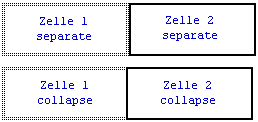 <!DOCTYPE HTML PUBLIC "-//W3C//DTD HTML 4.01//EN"> <html><head><title>border-collapse</title> </head><body> <table border="0"><tr> <th colspan="3">Normaleinstellung</th> </tr><tr> <td style="border:medium solid blue">Haus</td> <td style="border:medium dashed blue">Auto</td> <td style="border:medium dotted blue">Boot</td> </tr></table> <table border="0" style="border-collapse:collapse"><tr> <th colspan="3">Spezialeinstellung (collapse)</th> </tr><tr> <td style="border:medium solid blue">Haus</td> <td style="border:medium dashed blue">Auto</td> <td style="border:medium dotted blue">Boot</td> </tr></table> </body></html>
