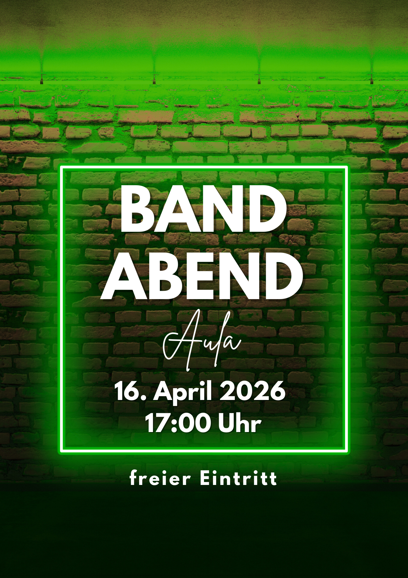 Beim großen Bandabend unserer Schule am 16.04.2026 ab 17.00 Uhr (Aula) zeigen unsere Schulbands was passiert, wenn man Probenkeller, Talent und eine ordentliche Portion Spaß mischt. Von rockigen Klassikern über Pop bis „Wir haben gestern erst angefangen, aber fühlen uns wie Superstars“ ist alles dabei! Freuen Sie sich auf mitreißende Livemusik, überraschende Bühnenmomente und vielleicht den nächsten großen Star.