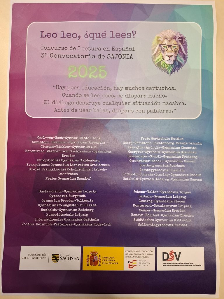 Inzwischen ist es schon Tradition, dass unsere Schule das Landesfinale von Leo, leo austrägt. Am 23. Oktober durften wir 47 Schülerinnen und Schüler von 34 Schulen aus ganz Sachsen zu diesem spanischen Vorlesewettbewerb bei uns begrüßen.