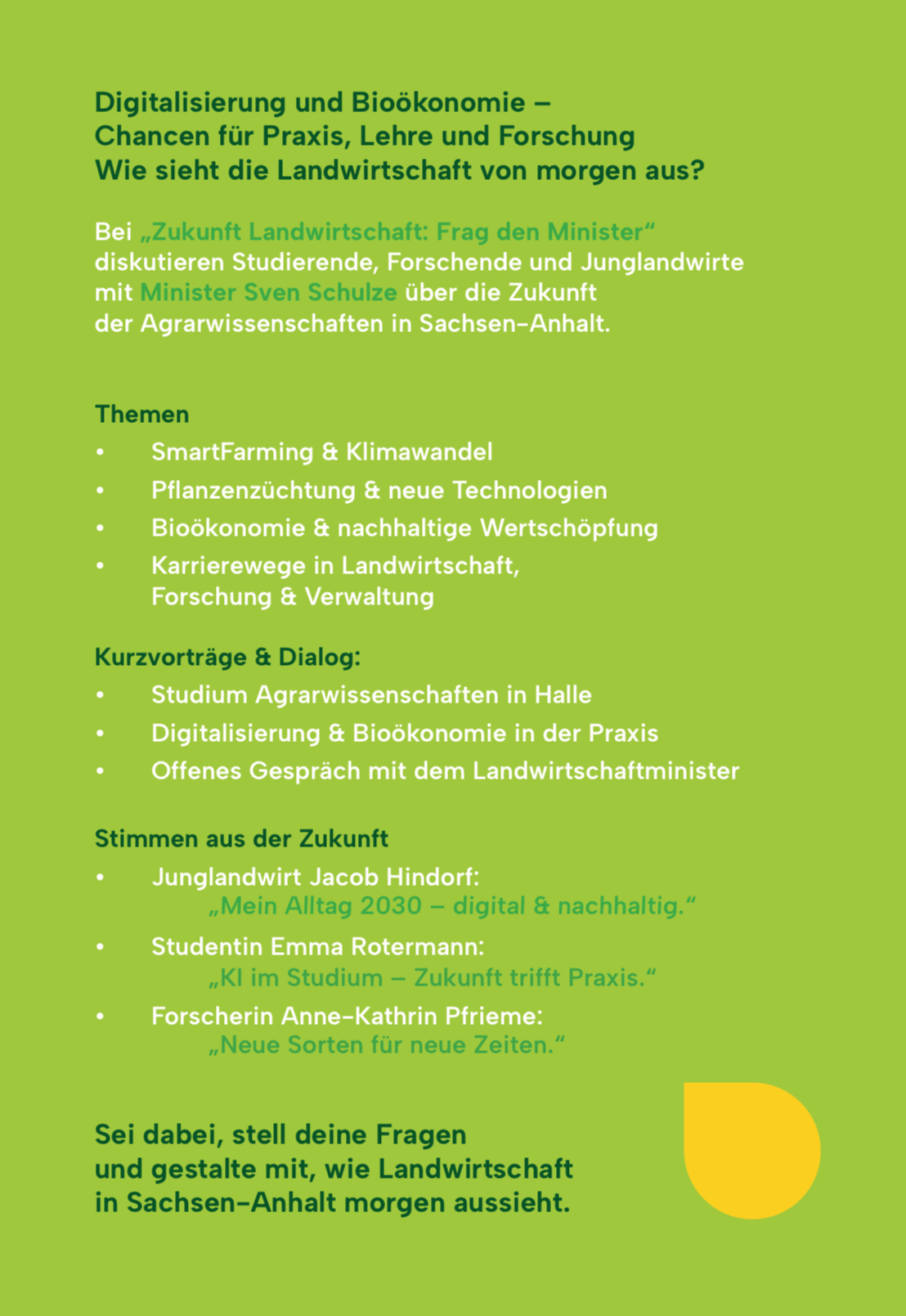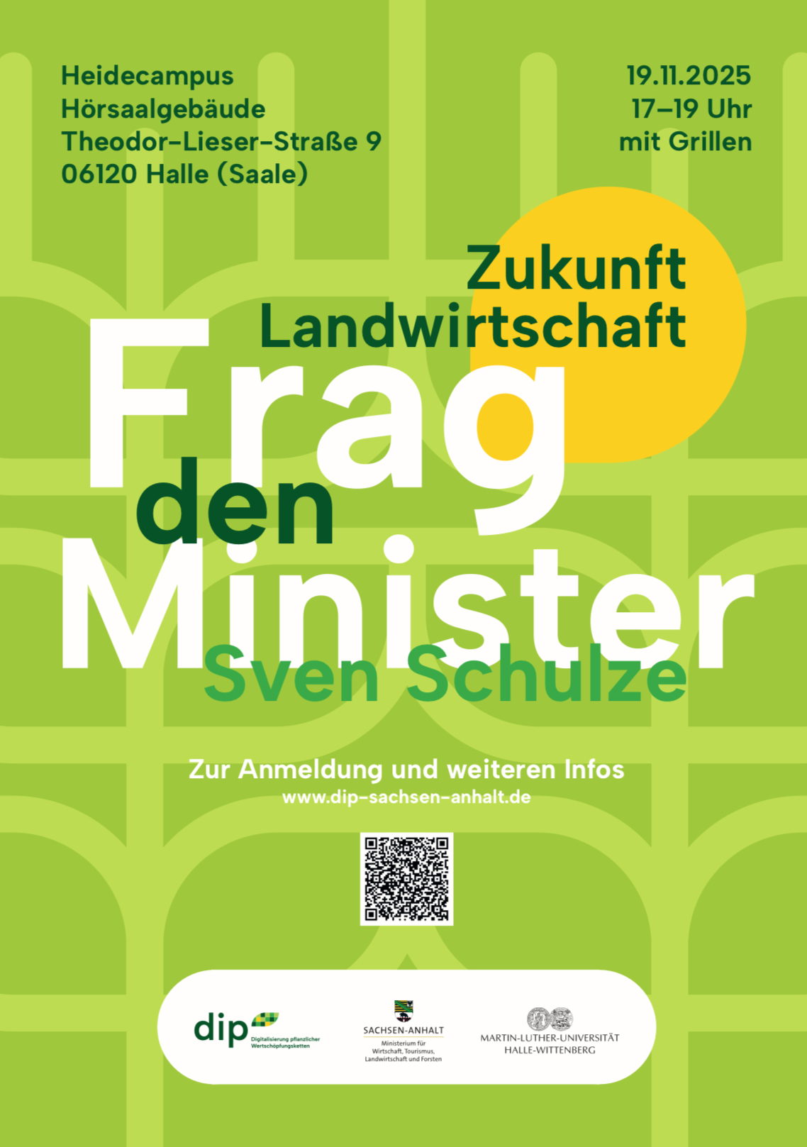 Zukunft Landwirtschaft – Frag den Minister“ Mittwoch, 19. November 2025, 17:00–19:00 Uhr Heidecampus Halle (Saale), Hörsaalgebäude, Theodor-Lieser-Straße 9