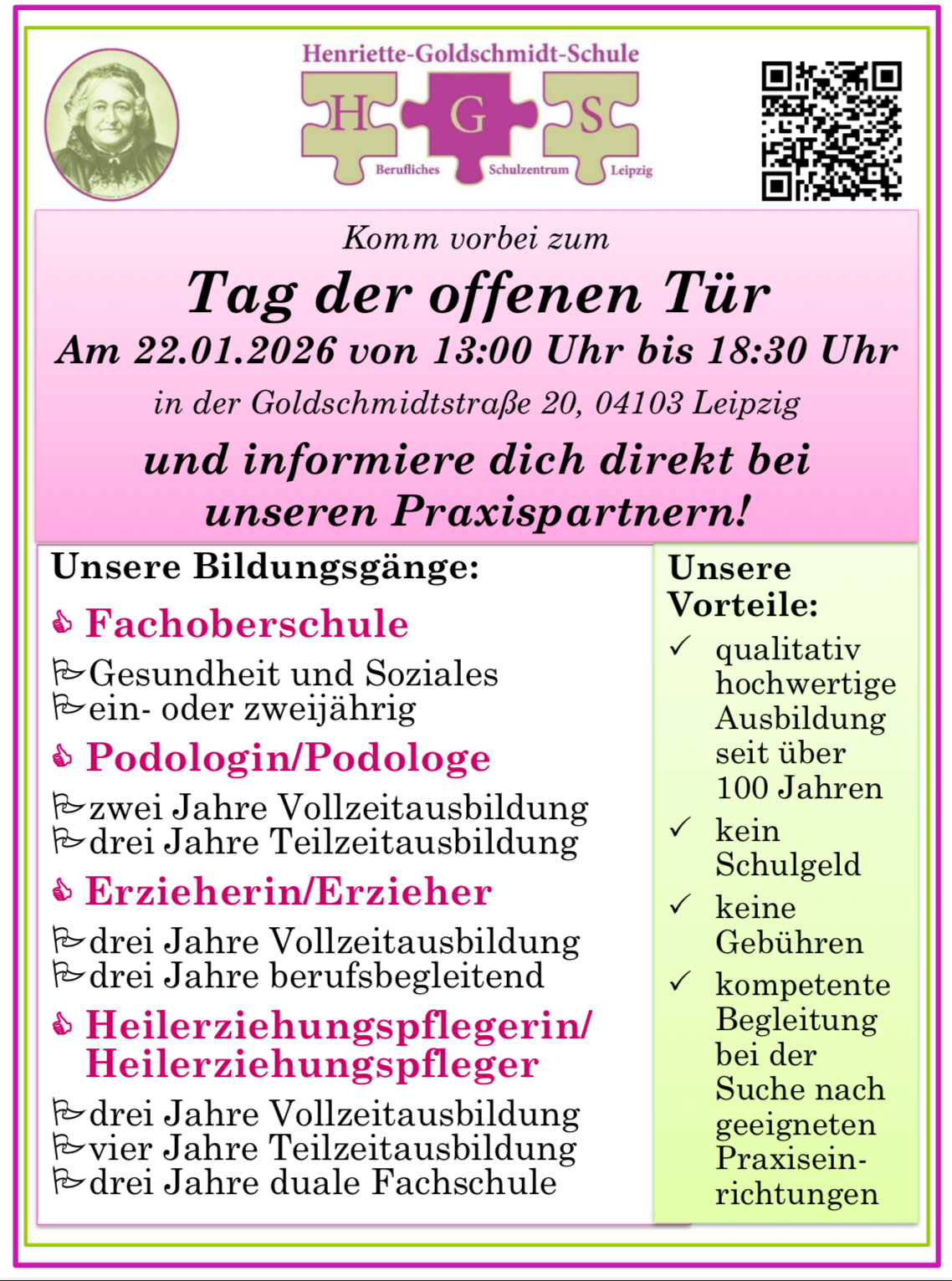 Im Sinne der Berufsorientierung freuen wir uns Sie herzlich zu unserem Tag der offenen Tür, an der Henriette-Goldschmidt-Schule – Berufliches Schulzentrum der Stadt Leipzig für Gesundheit und Soziales, einzuladen.
