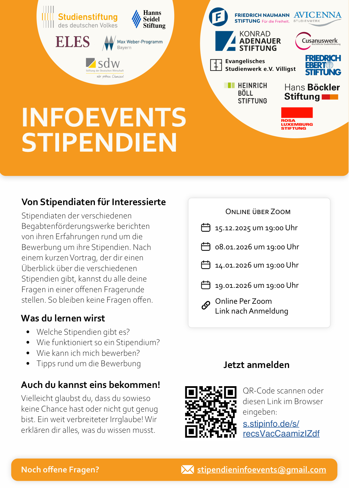 Unser Ziel ist es Schüler:innen und Studierenden die Chancen und Möglichkeiten eines Stipendiums nahe zu bringen. Dazu wollen wir sie unter anderem bei der Suche nach einem passenden Stipendium unterstützen, Tipps für die Bewerbung mit auf den Weg geben und als Ansprechpartner zur Verfügung stehen.