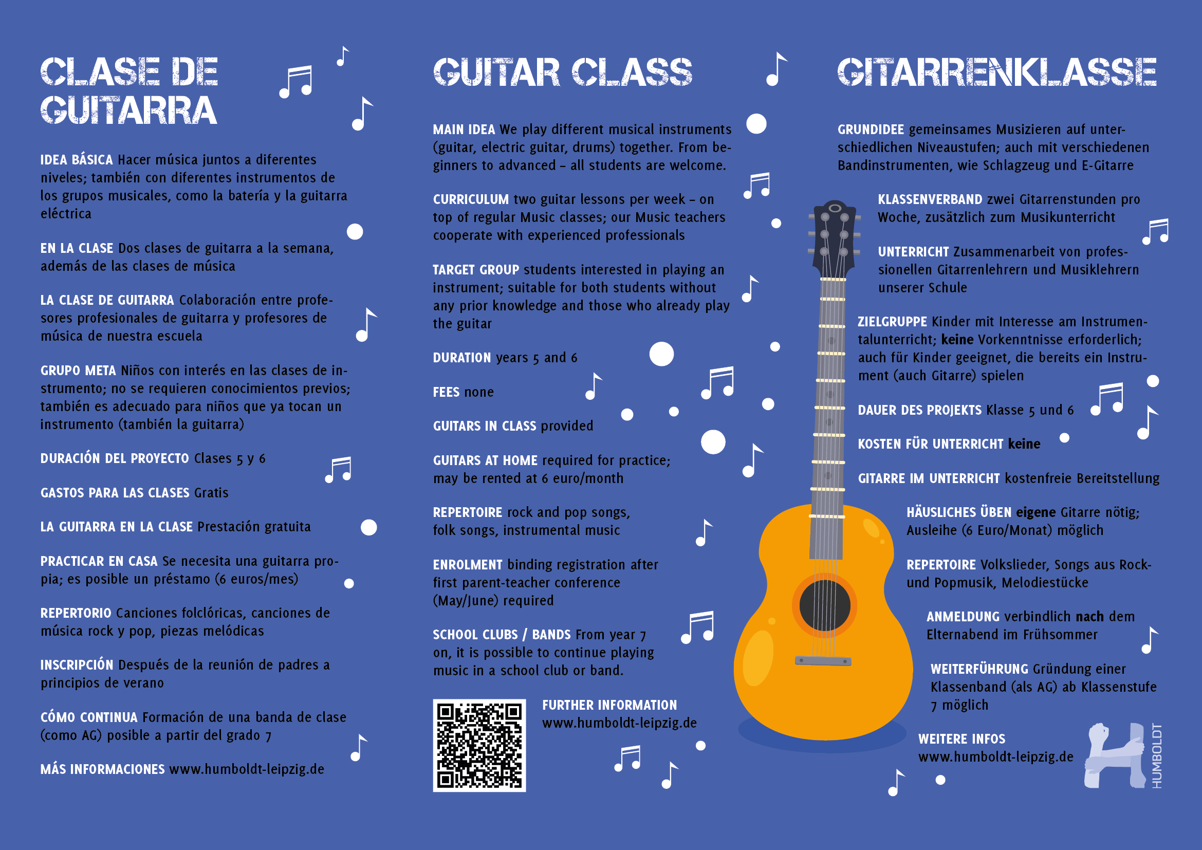 Zielgruppe sind Kinder, die Interesse am Instrumentalunterricht haben – sowohl Anfänger als auch diejenigen, die bereits ein Instrument, einschließlich Gitarre, spielen. Das Projekt umfasst die Klassenstufen 5 und 6. Es entstehen keine Kosten für den Unterricht, und die Gitarren für den Unterricht werden kostenfrei bereitgestellt. Für das Üben zu Hause ist jedoch eine eigene Gitarre erforderlich; alternativ kann ein Instrument für 6 Euro pro Monat ausgeliehen werden.