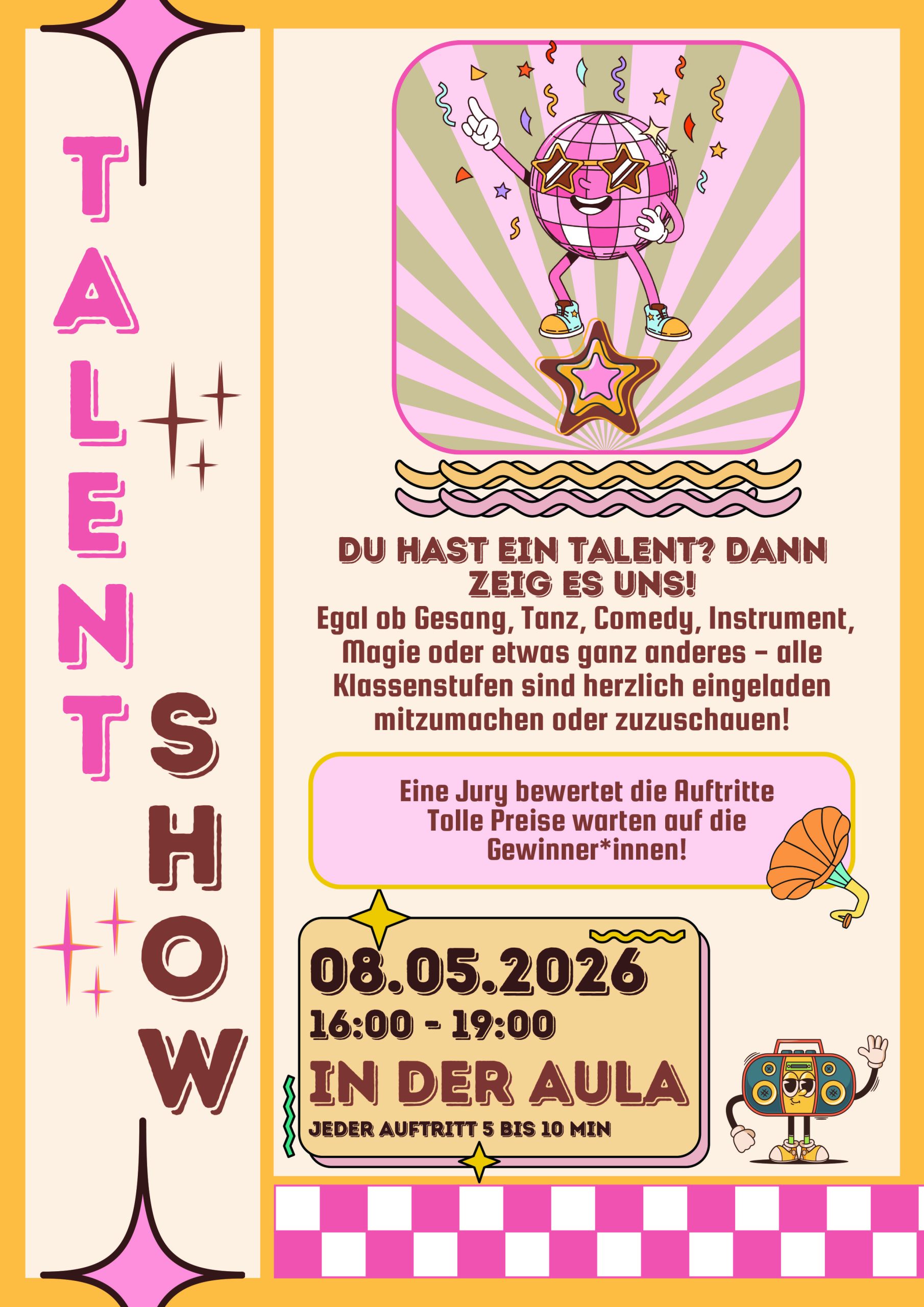 Am 08. Mai 2026 findet von 16:00 bis 19:00 Uhr unsere große Talentshow in der Aula statt. Ob Gesang, Tanz, Comedy, Instrument, Magie oder etwas ganz anderes – alle Klassenstufen sind herzlich eingeladen mitzumachen oder zuzuschauen. Eine Jury kürt die überzeugendsten Auftritte, die jeweils 5 bis 10 Minuten dauern dürfen. Es warten tolle Preise auf die Gewinner*innen.