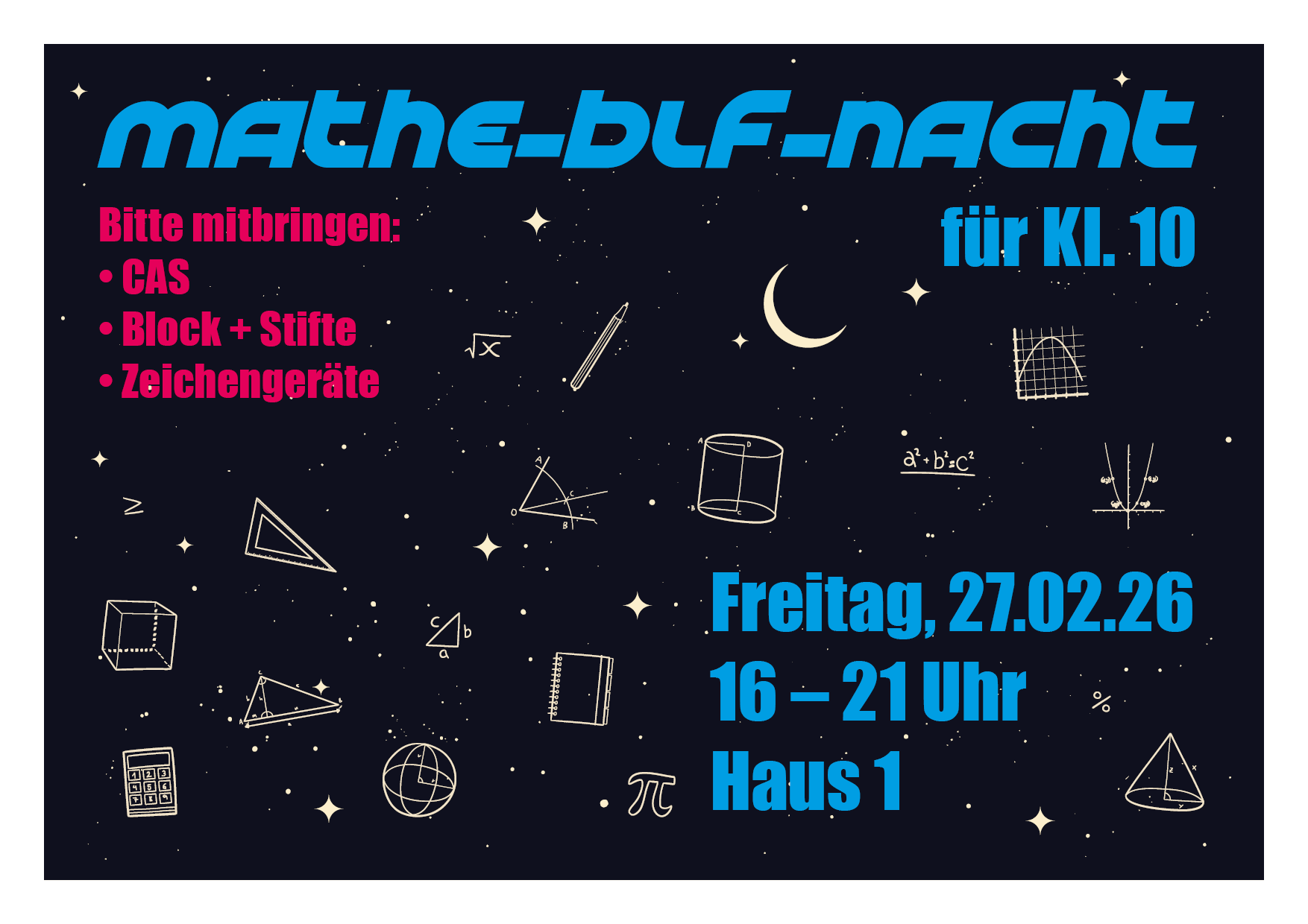 In Klasse 10 stehen Prüfungen in Deutsch, Englisch und Mathe an – die BLF. Um der Motivation auf die Sprünge zu helfen, kann am Freitag, 27.2.26 von 16-21 Uhr intensiv geübt und nachgefragt werden. Allein oder in der Gruppe, mit CAS oder hilfsmittelfrei, Geometrie, Stochastik oder Funktionen – es ist von allem und für jede und jeden etwas dabei 🙂