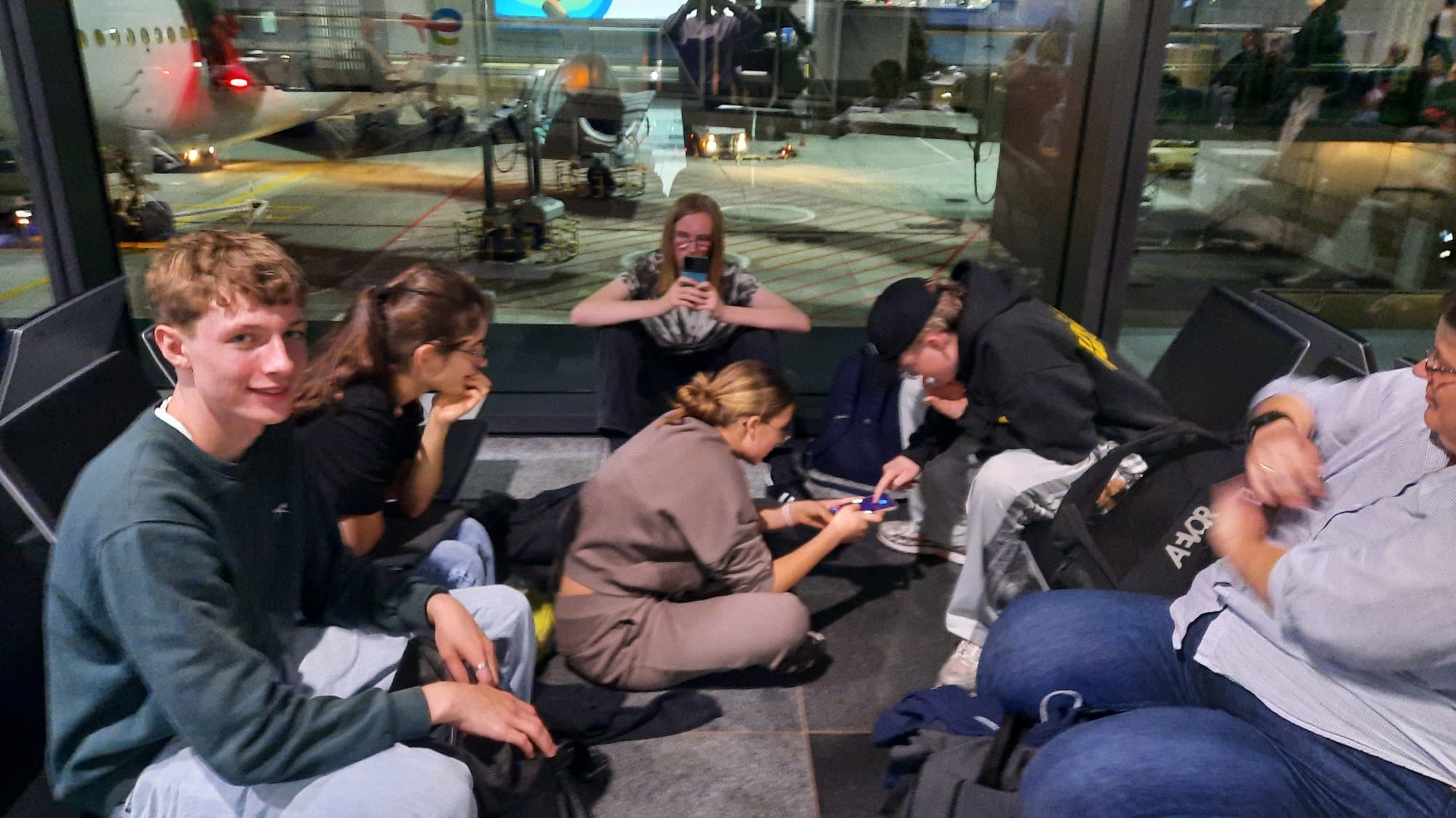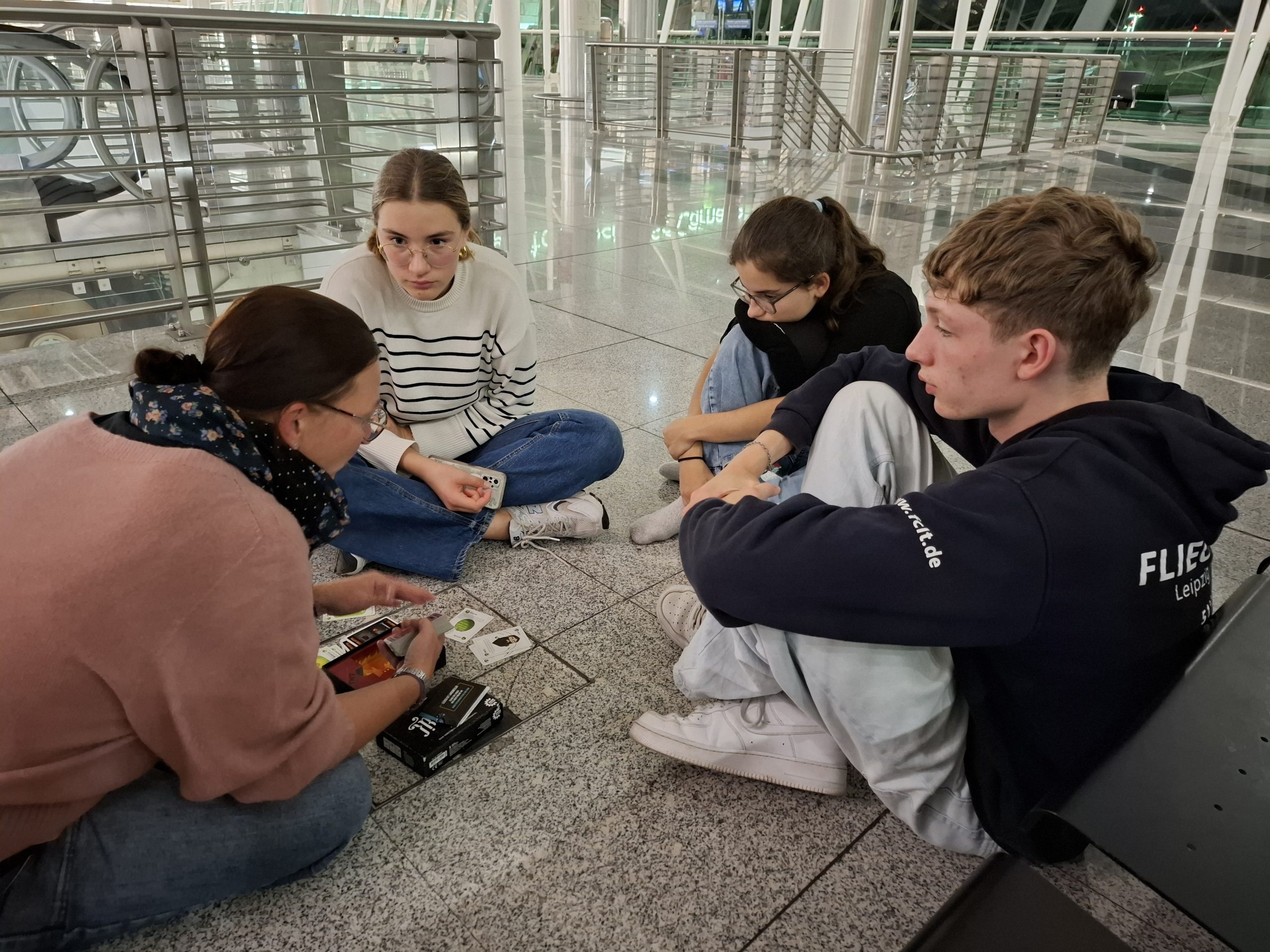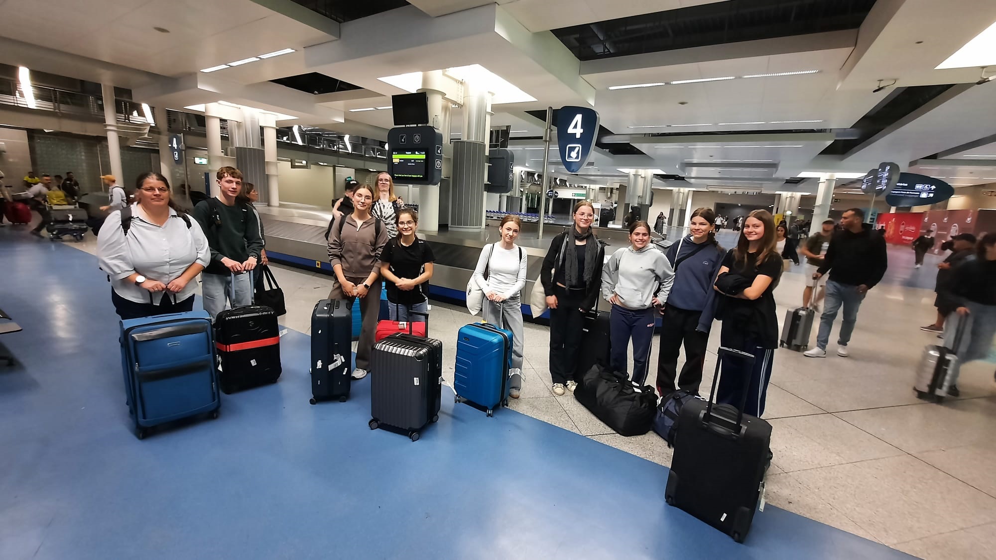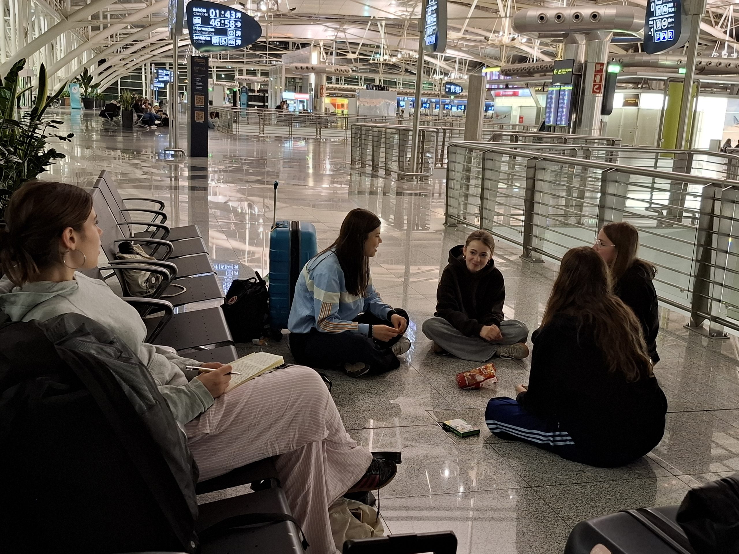 Unsere Gruppe, bestehend aus zehn Schülerinnen und Schülern der 9. Klasse sowie zwei Lehrerinnen, traf sich zur Mittagszeit vor den Check-in-Schaltern des Flughafens Leipzig/Halle. Das Aufgeben des Gepäcks und die anschließende Sicherheitskontrolle verliefen problemlos.