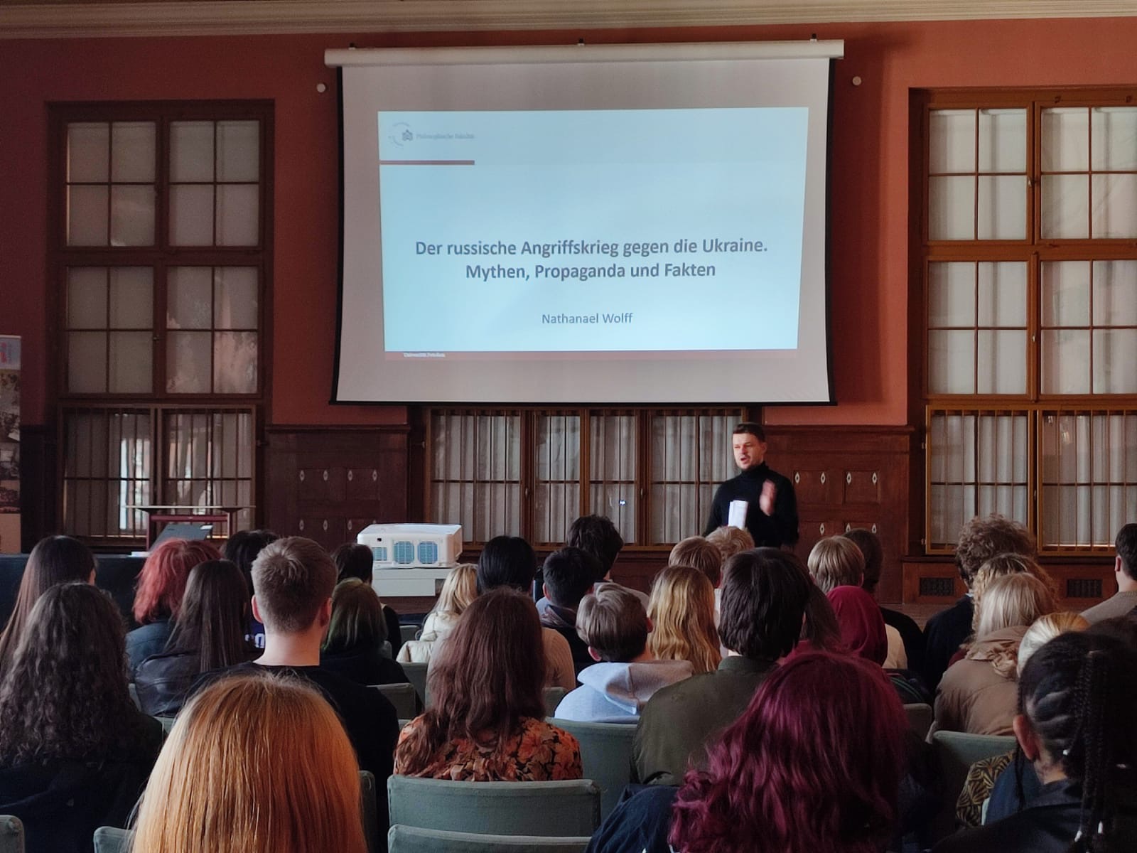 In seinem Vortrag ging er auf die russische Großinvasion, deren Hintergründe sowie auf die politischen und gesellschaftlichen Auswirkungen des Krieges ein. Im Anschluss an den Vortrag gab es die Möglichkeit, Fragen zu stellen und mit dem Referenten ins Gespräch zu kommen. Aufgrund der begrenzten Zeit wurde der Austausch teilweise im Anschluss an die Veranstaltung freiwillig fortgeführt.