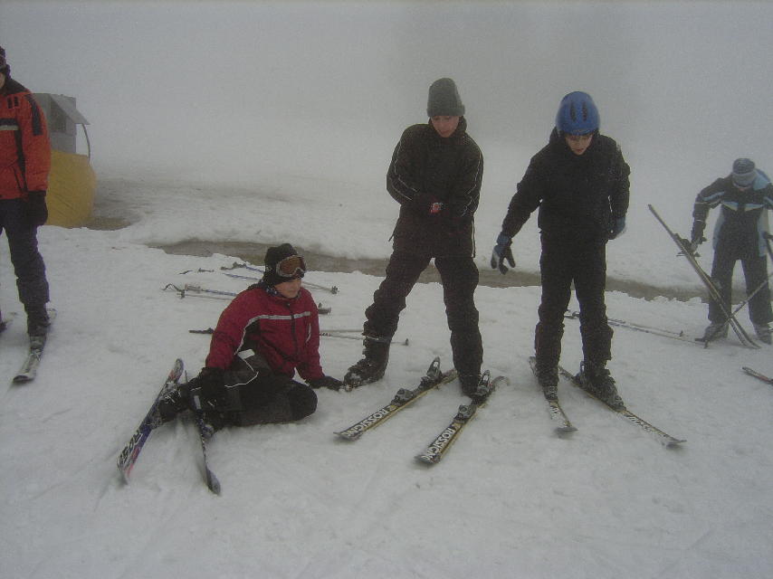 Der zweite Tag: Dienstag Wir sind um acht aufgestanden, um pünktlich halb neun zum Frühstück zu erscheinen! Wir haben in Ruhe gefrühstückt und danach haben wir unsere Skisachen angezogen, um pünktlich halb zehn mit kompletter Skiausrüstung am Bus zu sein! Nach 40 Minuten bangendem Warten haben wir dann endlich Schnee gesehen! Allerdings lagen nur 20 cm Schnee und es waren 4° C, was dazu führte, dass der Niederschlag als Regen runter kam, das wiederum einen dichten Nebel auslöste. Die Sicht war nicht sehr weit, man musste sehr aufpassen wo man hinfährt. Genauso miserabel wie das Wetter war auch der Schnee, der sehr nass war; aber wir haben nicht aufgegeben. Wir haben uns wacker durch den Schnee gekämpft, sind allerdings nicht ohne blaue Flecken davon- gekommen. Um 13.00 Uhr gab es dann endlich Essen, worüber wir sehr glücklich waren. Nach einer Stunde Pause sind wir dann weitergefahren. Der Nebel wurde immer dichter. Um 16.00 Uhr sind wir dann zum Bus, um zurück in unsere Unterkunft zu fahren. Als wir dann da waren, waren wir froh aus unseren nassen Skisachen raus zu kommen. 18.30 Uhr gab es Essen Putenschnitzel mit Pommes. Wir durften bis 22.00 Uhr wach bleiben, dann war Nachtruhe, doch viele waren bis tief in die Nacht wach. Diana, Mandy