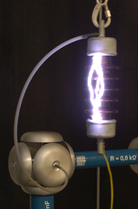 Höhepunkt der Führung waren natürlich die Experimente im Hochspannungslabor, welches durch einen Faradayschen Käfig komplett abgeschirmt war. Spektakuläre Blitze und die zugehörigen Donner entstanden bei der Entladung sowohl durch riesige Gleich- als auch Wechselspannungen. Wir danken nochmals der HTW-Dresden und insbesondere Herrn Bernd Förtsch für seine sehr lehrreichen, aber dabei stets unterhaltsamen Einblicke in die Welt der Ladungen.