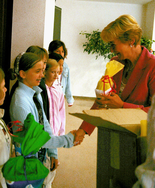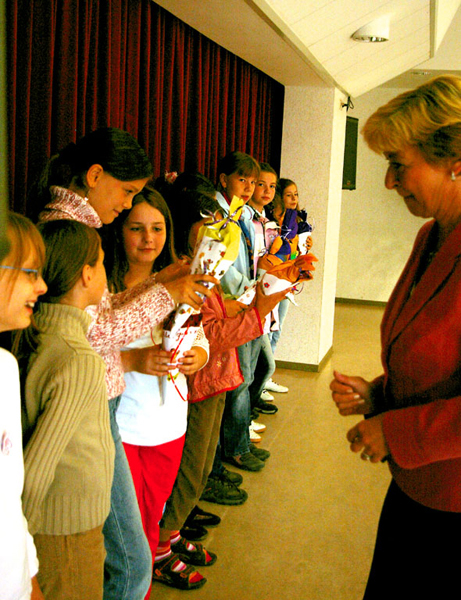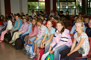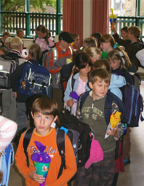 Doch solche Worte fielen nicht, denn die meisten Schüler und Schülerinnen der neuen 5. Klassen waren doch gespannt, was sich wohl in den von Mittelschülern liebevoll gebastelten Tüten befinden würde. An dieser Stelle einen großen Dank auch an den Schulförderverein, der die Befüllung finanzierte. Am 13.9. 2007 begann für 50 ehemalige Grundschüler eine neuer wichtiger Abschnitt in ihrem Leben: Sie wurden Schüler der Mittelschule Weixdorf. Im Festsaal wurden sie durch die Direktorin willkommen geheißen.