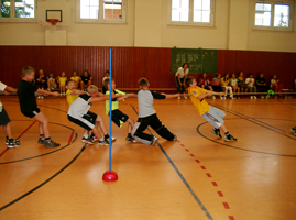 Auf der Bühne (bei der Übergabe der Zuckertüten) stellte sich heraus, dass nicht alle Tüten die lange Zeit des Wartens über die Sommerferien schadlos überstanden hatten. Doch so konnten die Schüler gleich erleben, dass im Schulalltag eben auch nicht alles perfekt verläuft und so muss auch kein Schüler Bedenken haben: Fehler und Schwierigkeiten gehören zum Leben dazu. Die Lehrkräfte der Mittelschule wünschen den 5. Klassen alles Gute für das kommende Schuljahr!