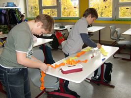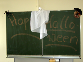 Wie in jedem Jahr erlebten die Schüler der fünften Klassen Englischstunden der besonderen Art: Sie feierten Halloween. Die Englischlehrerinnen hatten mehrere Stationen mit Wettbewerbscharakter vorbereitet. So wurden zum Abschluss zum Beispiel die tollsten Kürbisse, die schnellsten Fledermäuse, die längste Halloweengirlande oder der pfiffigste Quizteilnehmer prämiert. Die fleißigen Bäckerinnen der 8.Klasse sorgten noch für eine Extraüberraschung- se versorgten alle mit ofenfrischen Muffins.