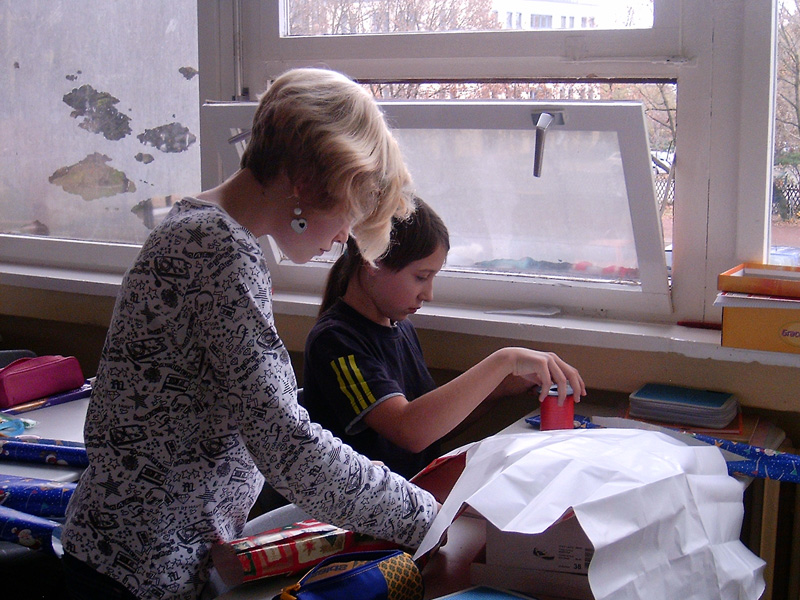 Mit hochroten Wangen kämpften die Schüler mit Geschenkpapier, Schere und Klebeband, um den Weihnachtspäckchen einen passenden äußeren Rahmen zu geben. Mitarbeiter des Arbeitskreises "Humanitäre Hilfe" holten die Päckchen ab und werden sie auf die Reise nach Saporoschje in die Ukraine schicken.