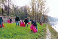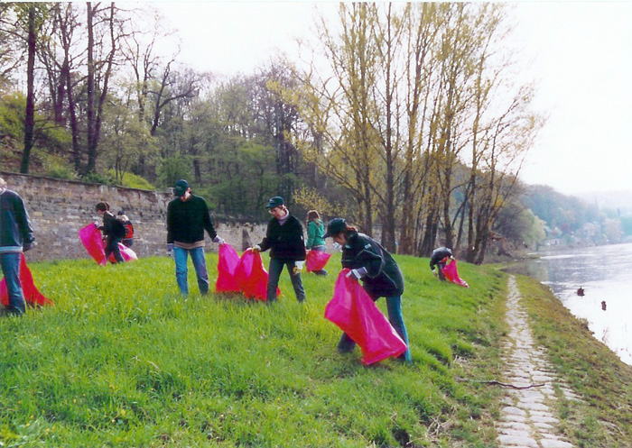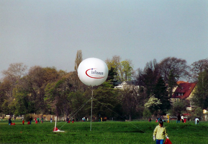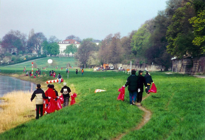 Am Sonnabend, 23.04.2005, war es wieder so weit. Als ich am Waldschlösschenareal in Richtung Saloppe schaute, sah man das bekannte Bild. Im satten Grün der Elbwiesen bewegten sich hektisch oder auch weniger hektisch kleine dunkle Punkte mit blauen Kappen und komischen dunkelroten Plastiktüten. Kurz vor der Saloppe schwebte der Infineon-Ballon über der Wiese. Also holte ich mir ein paar Arbeitshandschuhe, eine Infineon-Kappe und eine rote Mülltüte und los ging es zum großen Elbwiesen reinigen. Seit nunmehr vielen Jahren treffen sich dabei die Mitarbeiter von Infineon Dresden, Schüler und Lehrer der Mittelschule Weixdorf (früher der 86. Mittelschule) zu diesem Event. Eine schöne Tradition.