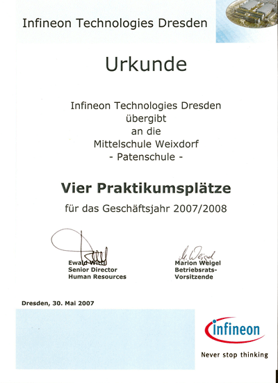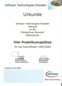 Das Berufswahlgespräch am 30. Mai war Anlass für den Personalleiter von Infineon Dresden, Ewald Wittl, vier Praktikumsplätze für die Patenschule zuzusagen. Aus den 8. und 9. Klassen können sich also bei der Schulleitung ab dem neuen Schuljahr (2007/08) vier Schülerinnen und Schüler für ein Praktikum bei Infineon Technologies Dresden bewerben. Ausgewählt werden natürlich die Besten entsprechend des Verhaltens und der Leistung. Zusätzlich wird der Patenbetrieb im neuen Schuljahr für ein Bewerbertraining für Schüler bereit stehen, um Starthilfe für den beruflichen Entwicklungsweg zu geben, egal wo man sich bewirbt.